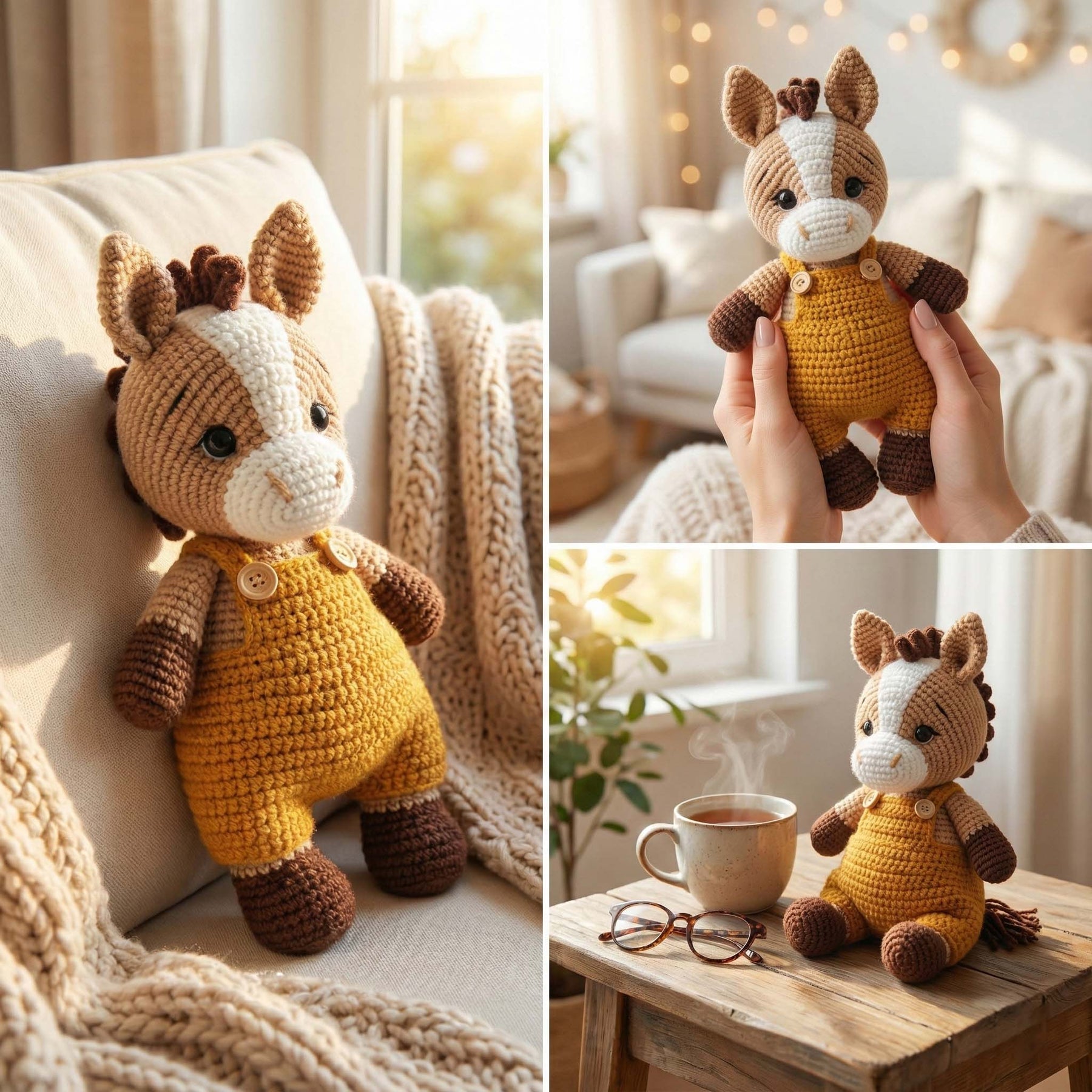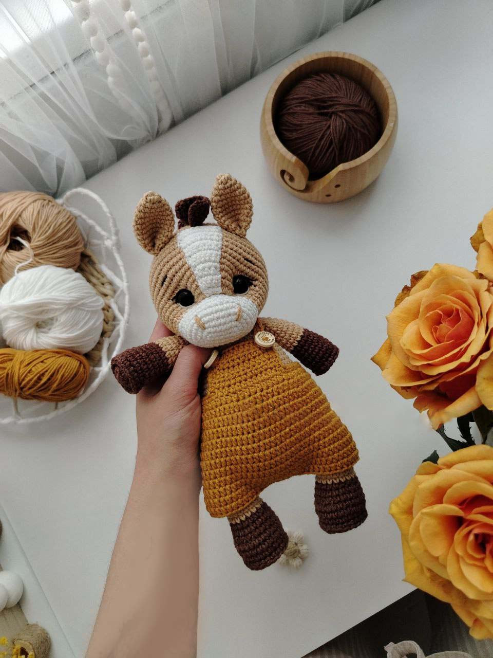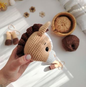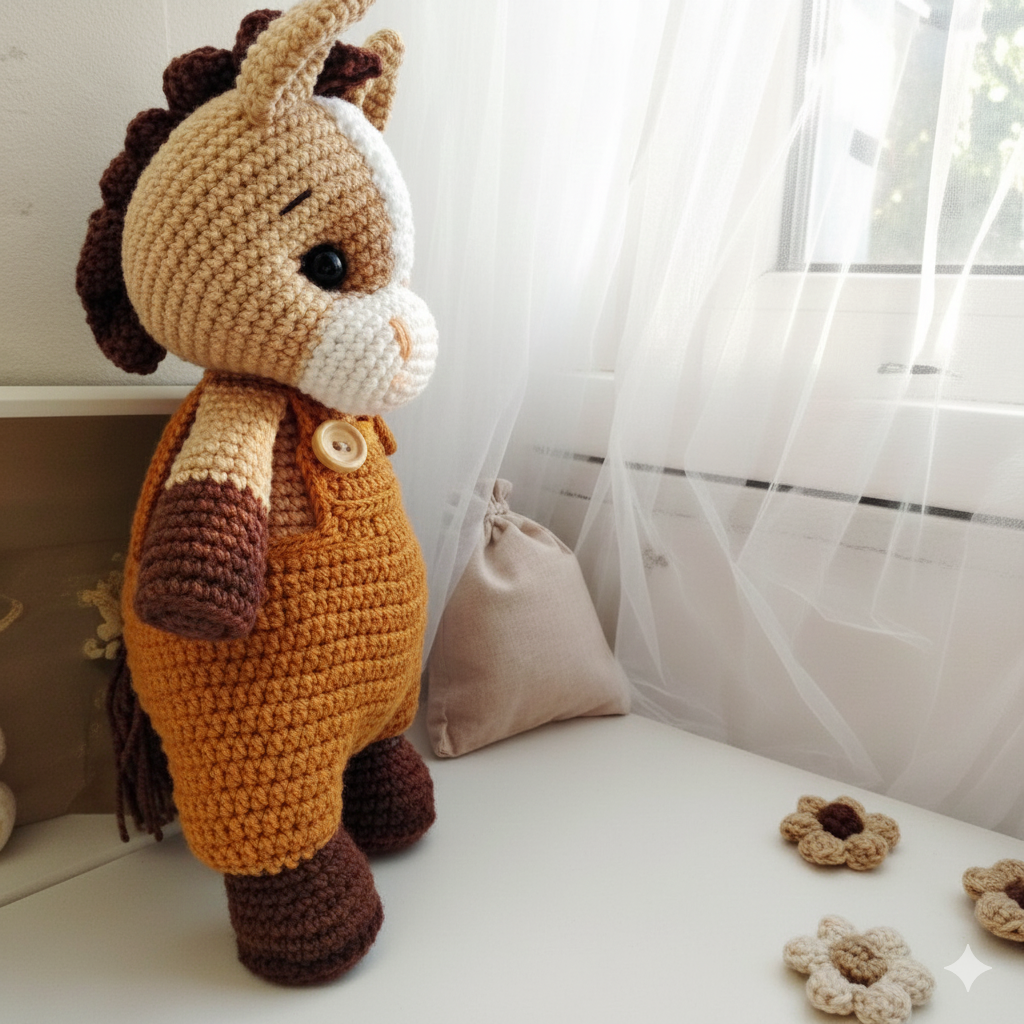 • Yarn: Main color (Beige/Brown), White (Muzzle), Brown (Hooves/Mane)